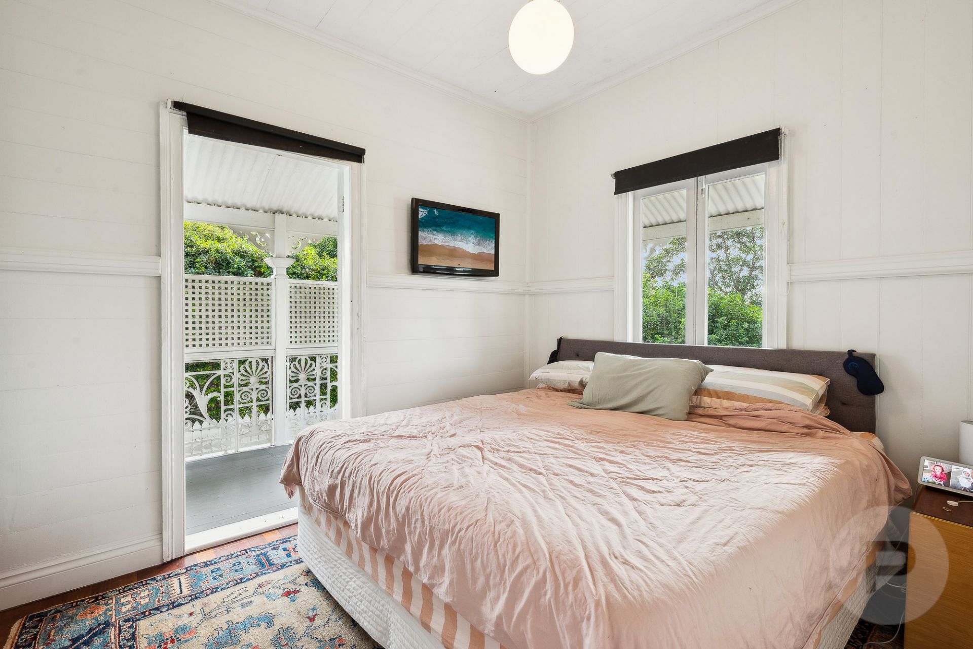 - Wrap around front verandah features decorative iron railings and privacy screening