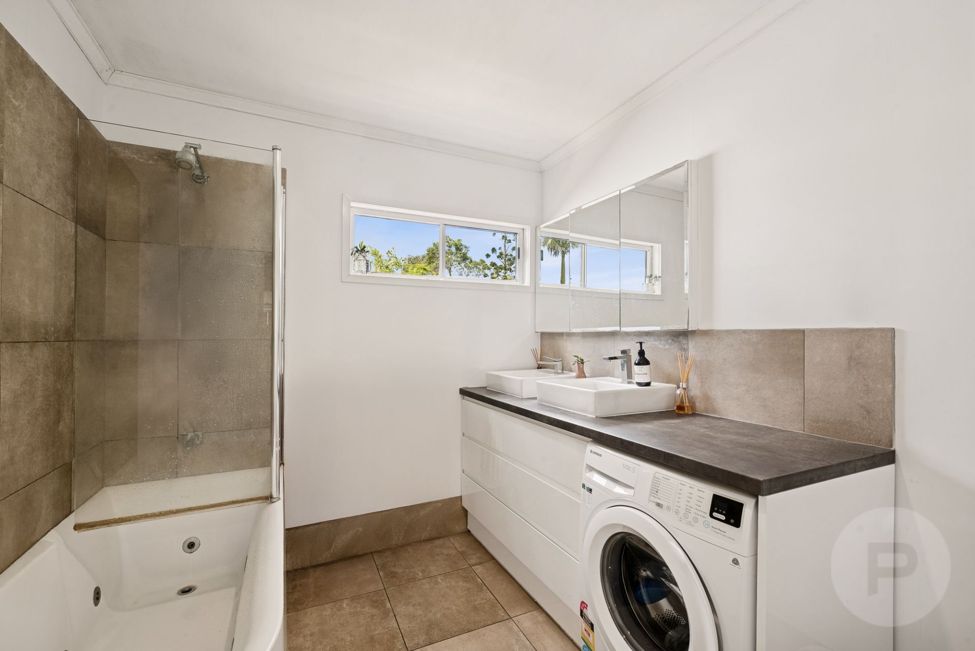 * Family bathroom with dual vanity, shower bath and incorporated laundry